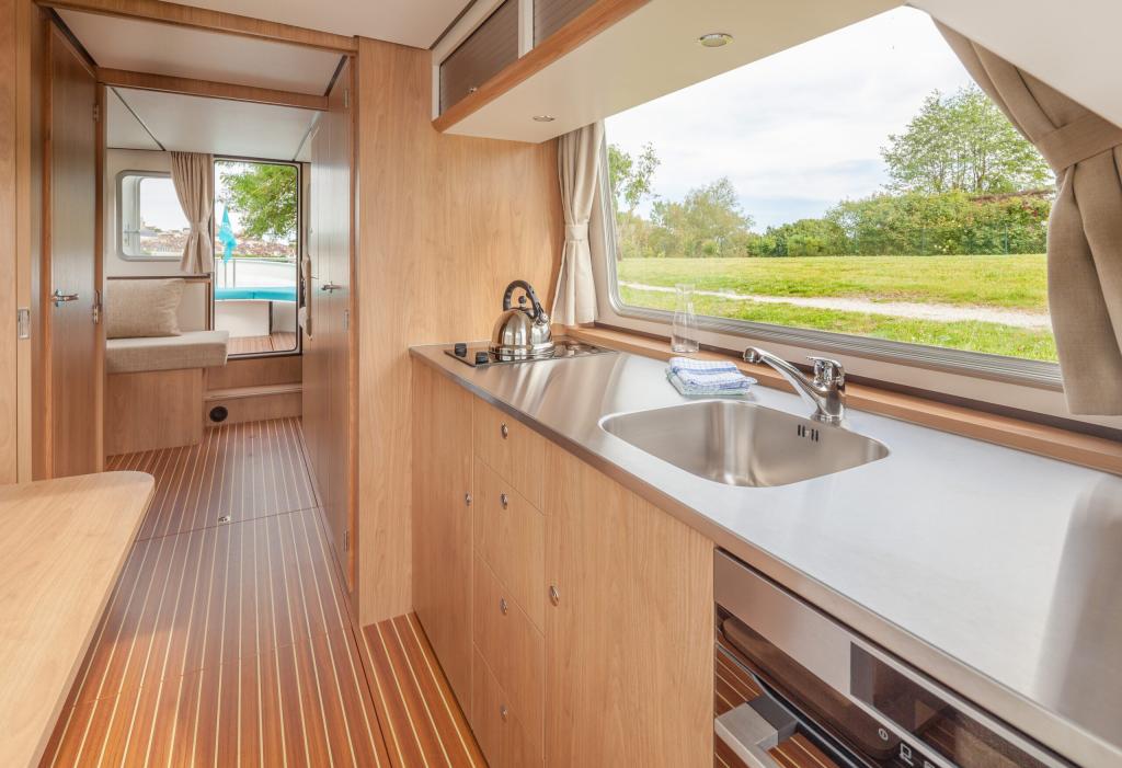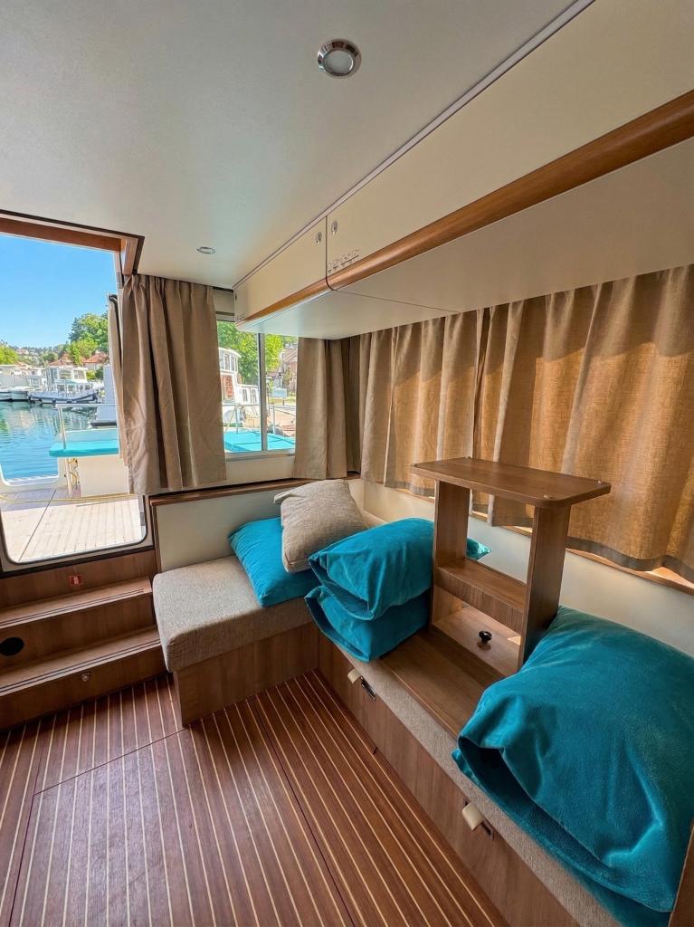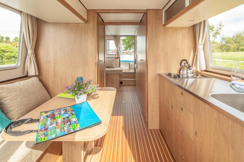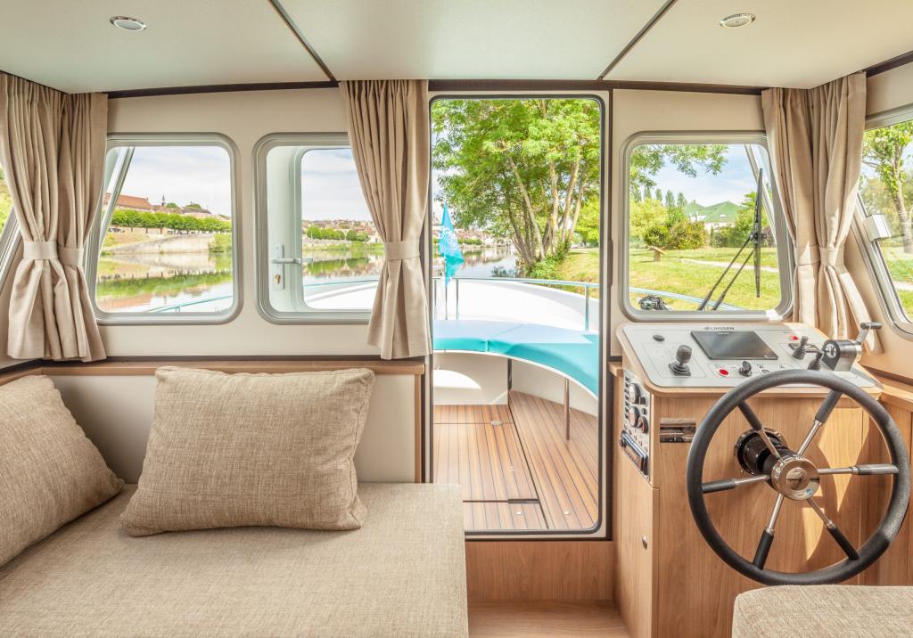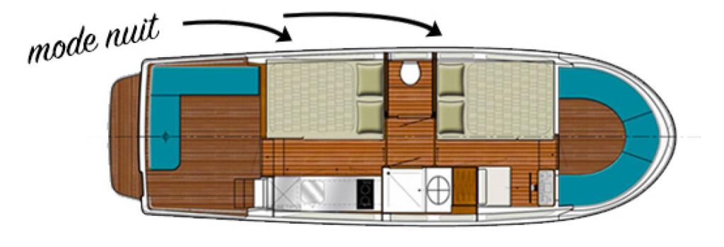 The Pénichette Terrasse® Sleeps 8/12 – 4 Cabins offers a pleasantly light and airy interior but also 4 large cabins individually equipped with a handbasin, as well as a beautiful covered aft terrace-deck that extends the stay at the back of the boat.