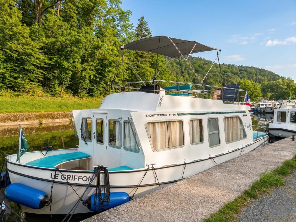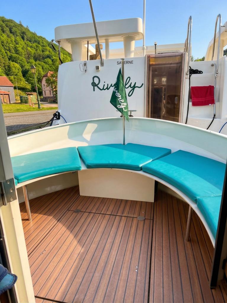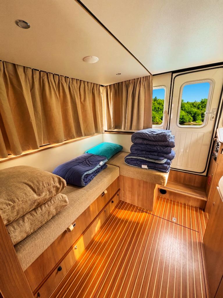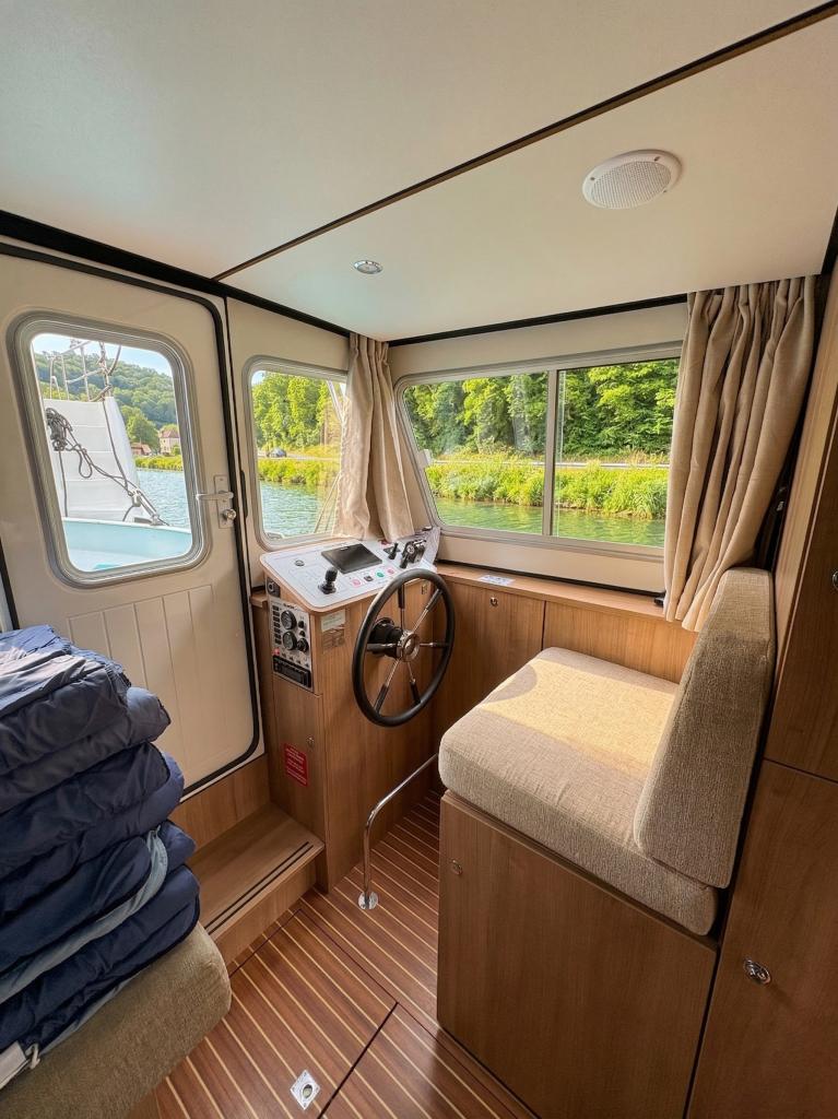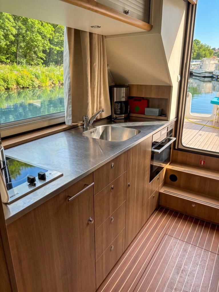 The Pénichette Terrasse® Sleeps 8/12 – 4 Cabins offers a pleasantly light and airy interior but also 4 large cabins individually equipped with a handbasin, as well as a beautiful covered aft terrace-deck that extends the stay at the back of the boat.
