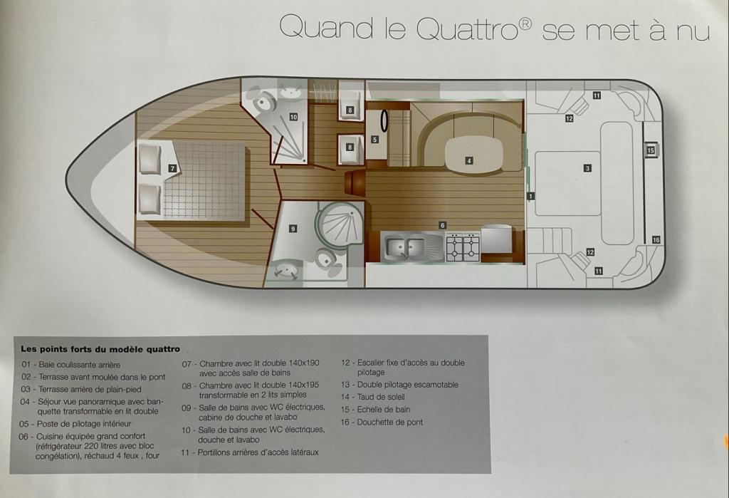 Construit en 2012 par le chantier Nicols, ce bateau est un modèle exceptionnel réalisé initialement “sur mesure” pour un client privé. Considérant ce nouvel aménagement intéressant pour l’univers de la location, ce bateau “sur mesure” a ensuite inspiré la célèbre série Estivale Quattro S du constructeur.